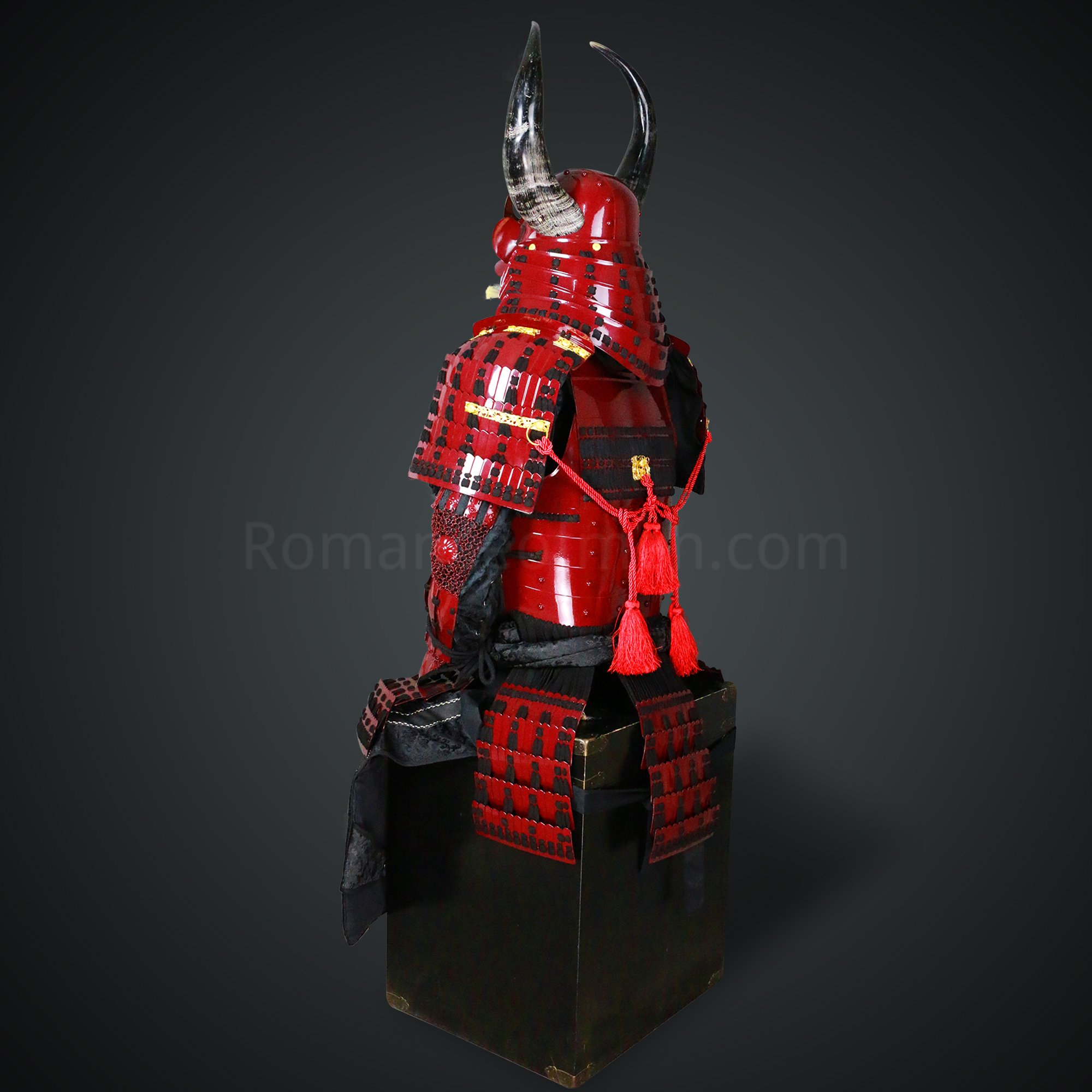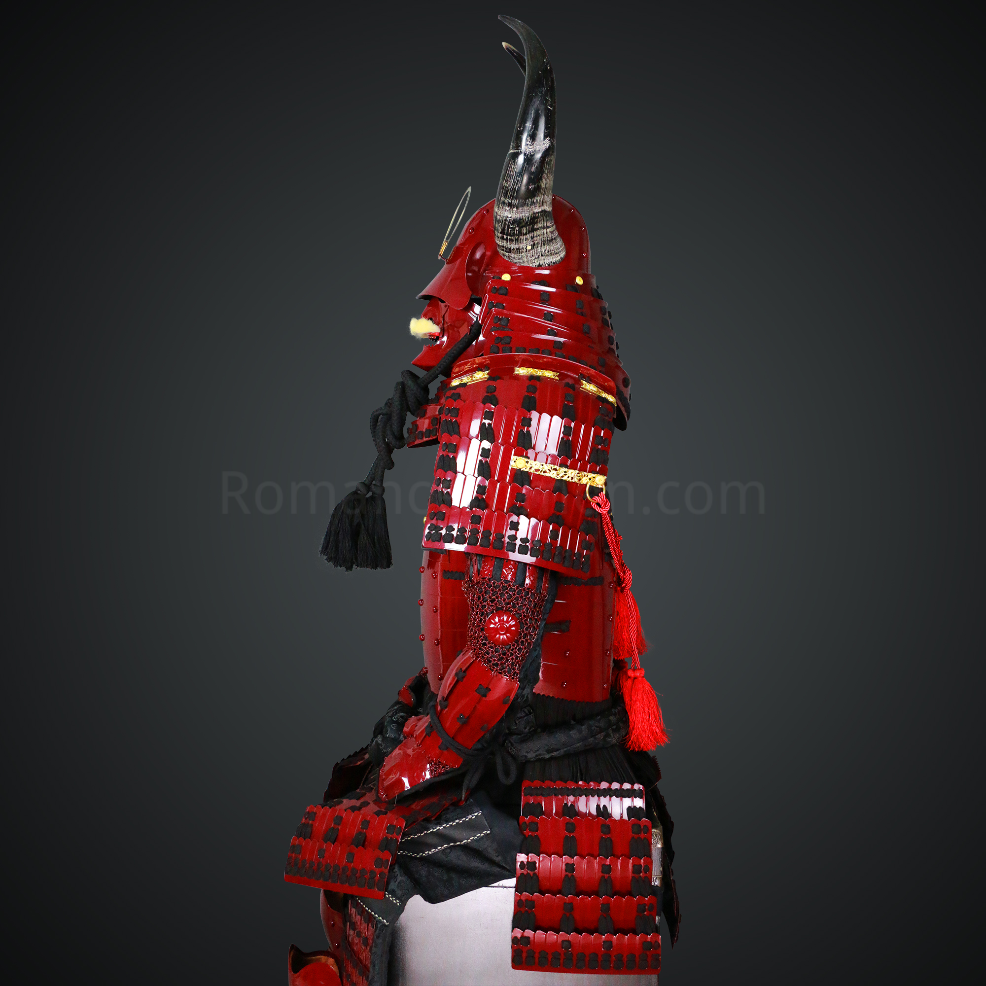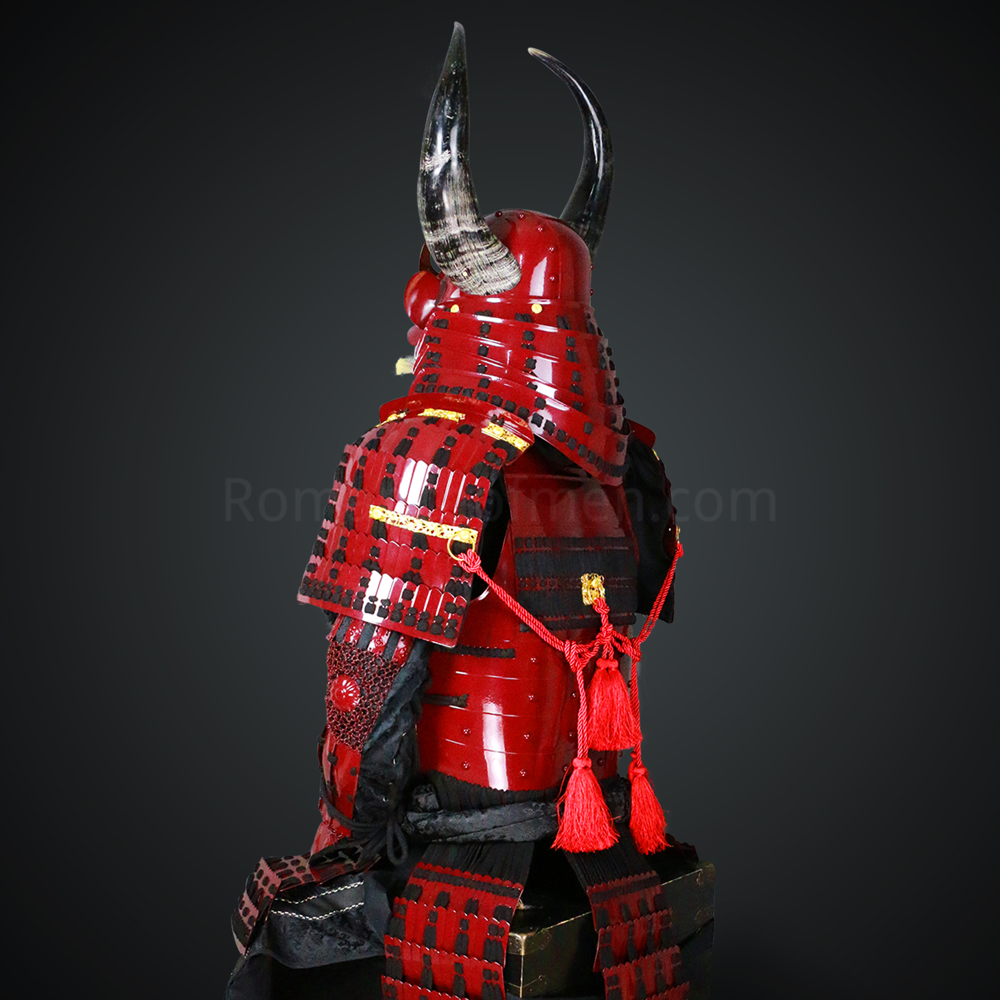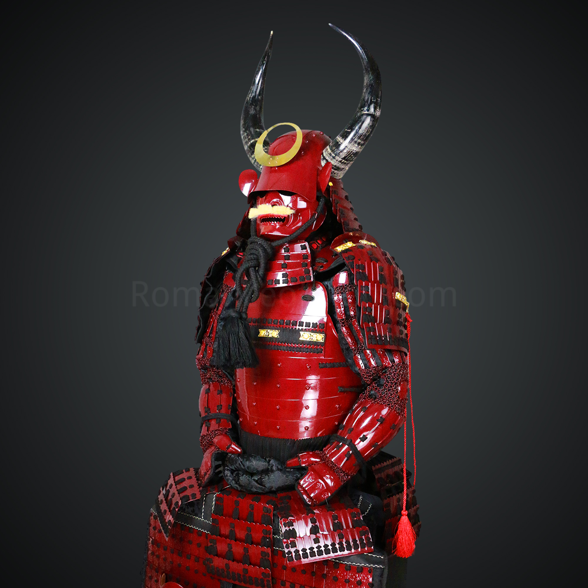 Shibata Katsuie Red and Black Samurai Armor Tosei Gusoku Style Buffalo Horn Wakidate Circle Maedate Shiny Red Scales and Black Cords