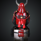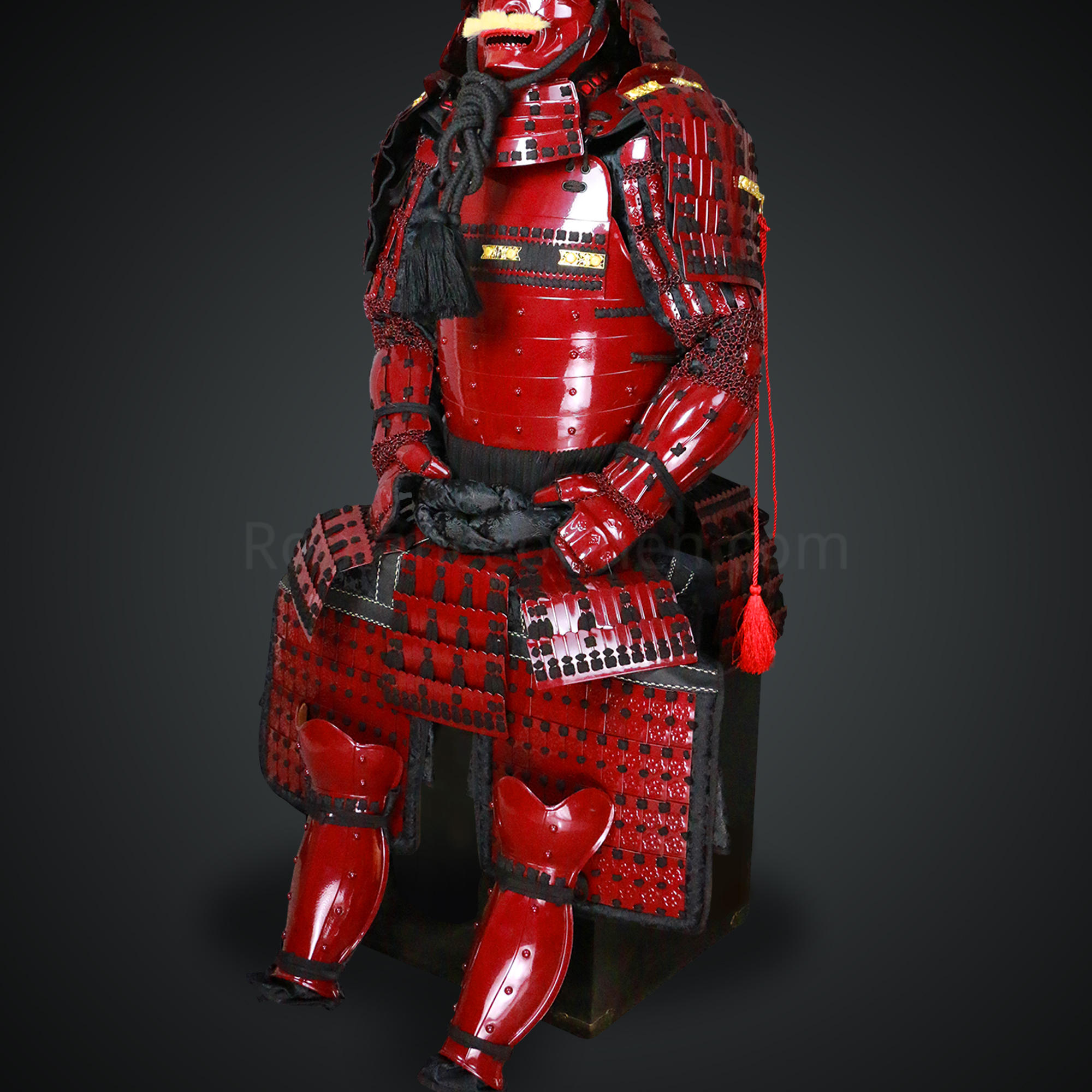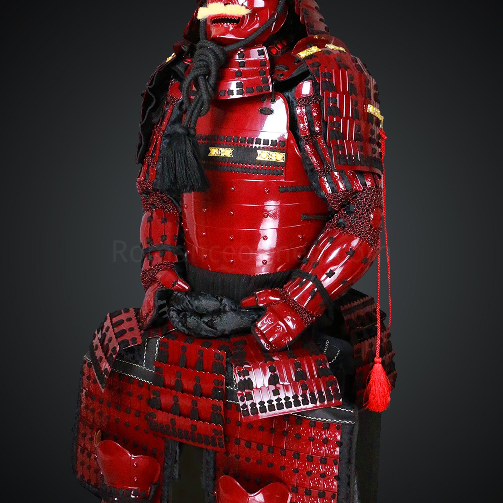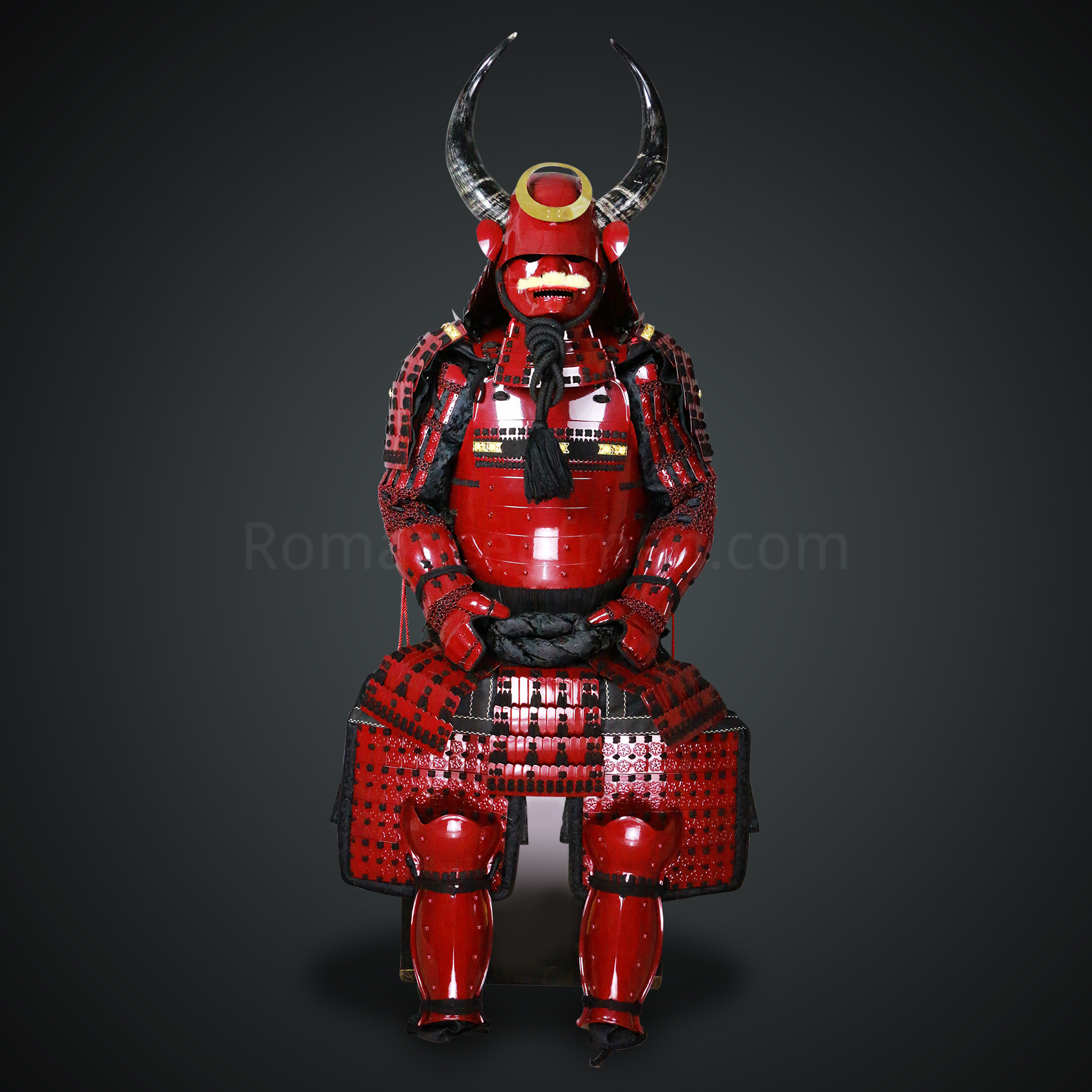 Shibata Katsuie Red and Black Samurai Armor Tosei Gusoku Style Buffalo Horn Wakidate Circle Maedate Shiny Red Scales and Black Cords