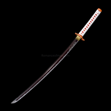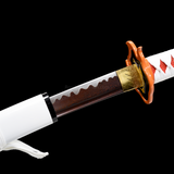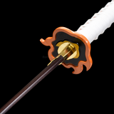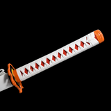 Rengoku wields a standard size Nichirin katana, the blade has flame pattern on it, and with the word “Destroy Demons” (惡鬼滅殺) engraved. The tsuba is also like a flame shape, in red and orange color. In the anime the Saya is white and grey.